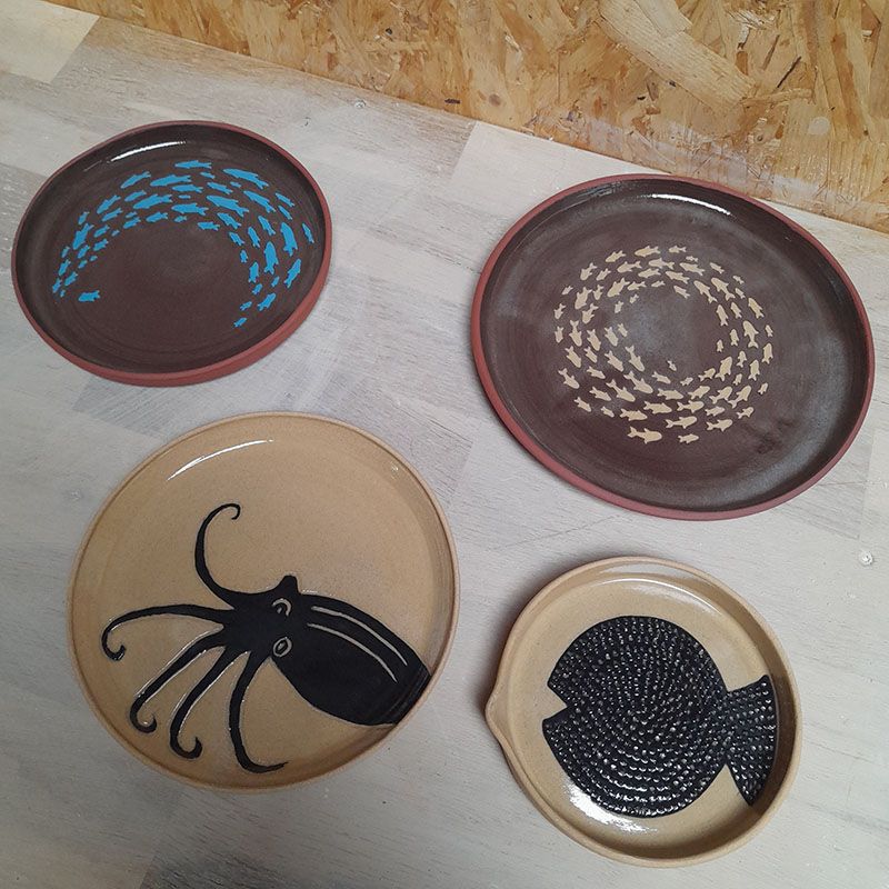 Toutes les créations de Cérafu Céramique sont faîtes à la main, dans mon atelier du Morbihan. Elles sont en grès, terre résistante à cuisson haute température, puis émaillées, ce qui les rend étanches. J’utilise des terres de couleur et laisse toujours la terre en partie apparente car j’aime la richesse des tons que nous propose la nature. Je les décore à l’engobe, un mélange de terre, d’eau et de colorants, pour vous offrir des motifs originaux et poétiques, principalement maritimes.