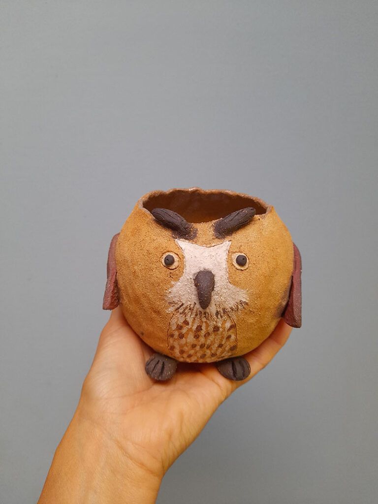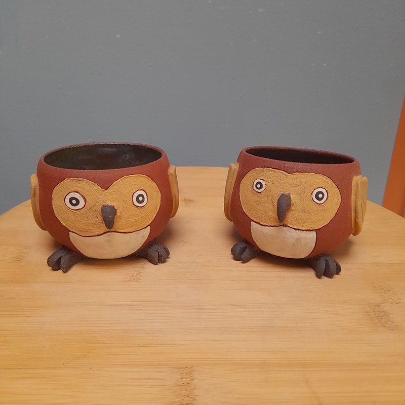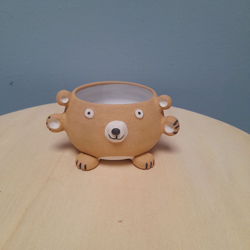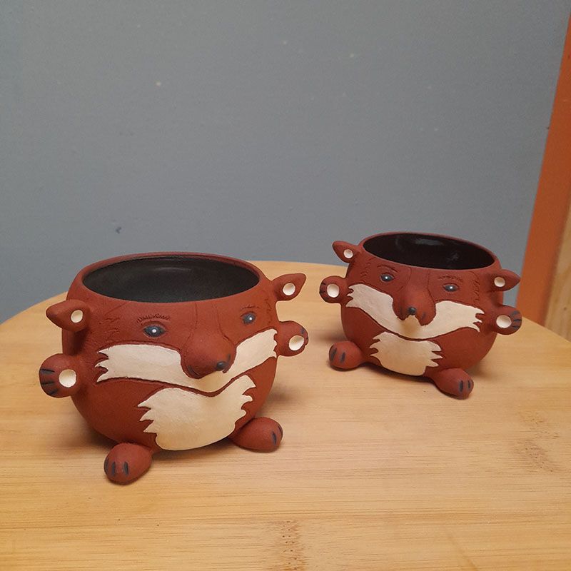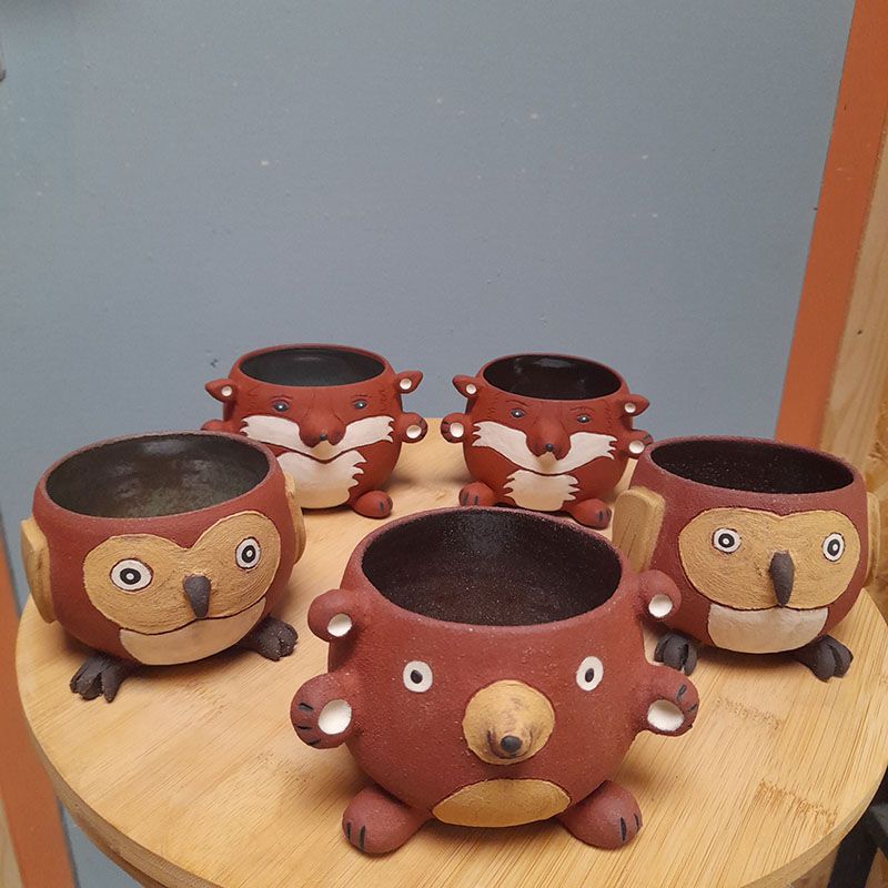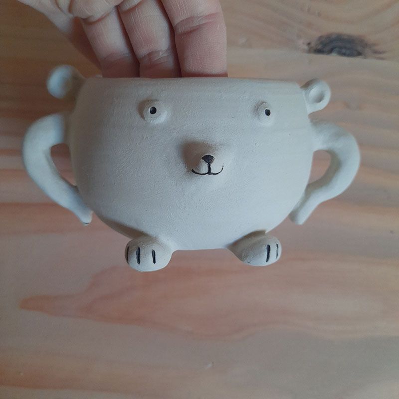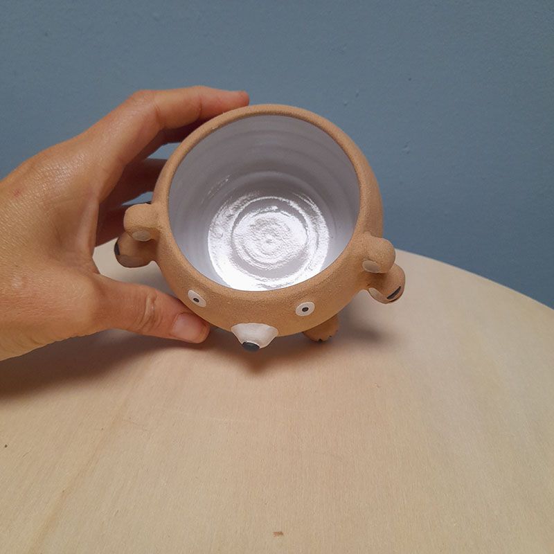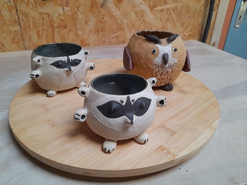 Toutes nos créations sont réalisées à la main dans notre atelier du Morbihan. Elles sont faites en différents grès, des terres à cuisson haute température. Elles sont ainsi résistantes et très peu poreuses. Elles sont souvent décorées avec des motifs à l’engobe, mélange de terre, d’eau et de colorants. Elles sont ensuite émaillées, ce qui les « vitrifie » et les rend complètement étanches, lisses, brillantes et leur donne leurs couleurs finales. Les motifs, le poids, la taille, peuvent varier d’une pièce à l’autre, celles-ci étant toutes des pièces uniques !